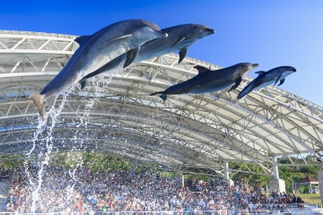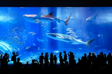 正面の巨大アクリルパネルを始め、「アクアルーム」など多方向から観覧できる容量7,500㎥の大水槽です。大水槽を正面から眺めることのできる専用のシートもあります。