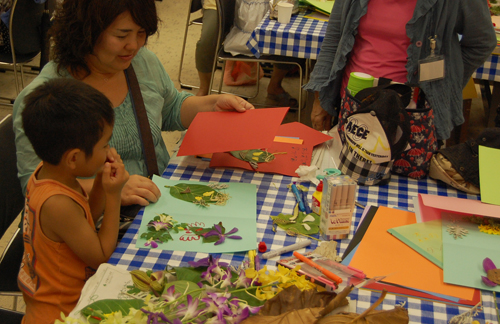 - 草花の解説、鑑賞したあと、熱帯・亜熱帯都市緑化植物園でお花や葉っぱを使った絵本作りをします。