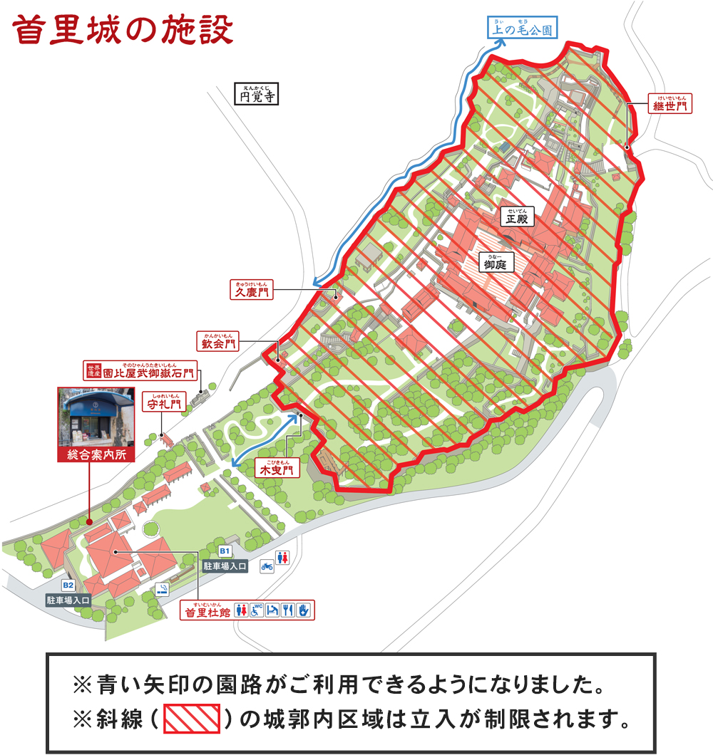 首里城正殿火災の影響により、首里城公園(有料施設を含む園内施設)は臨時休園・休場していましたが、11月5日(火)より一部施設を開園しています。