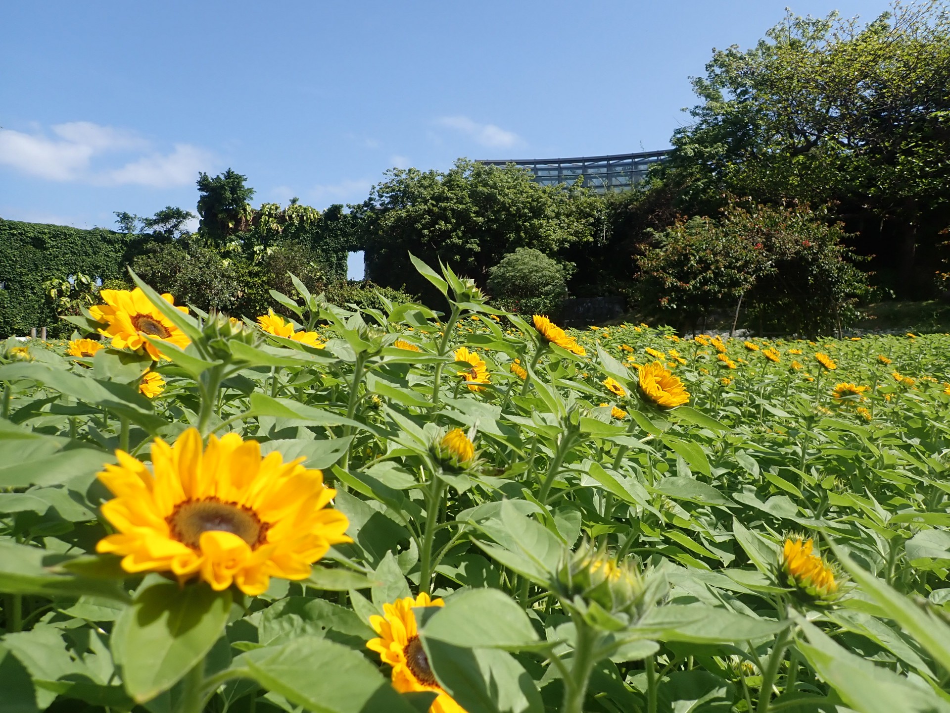 本日は晴天ということもあり、一面のひまわりも光を浴びて開花を始めています!