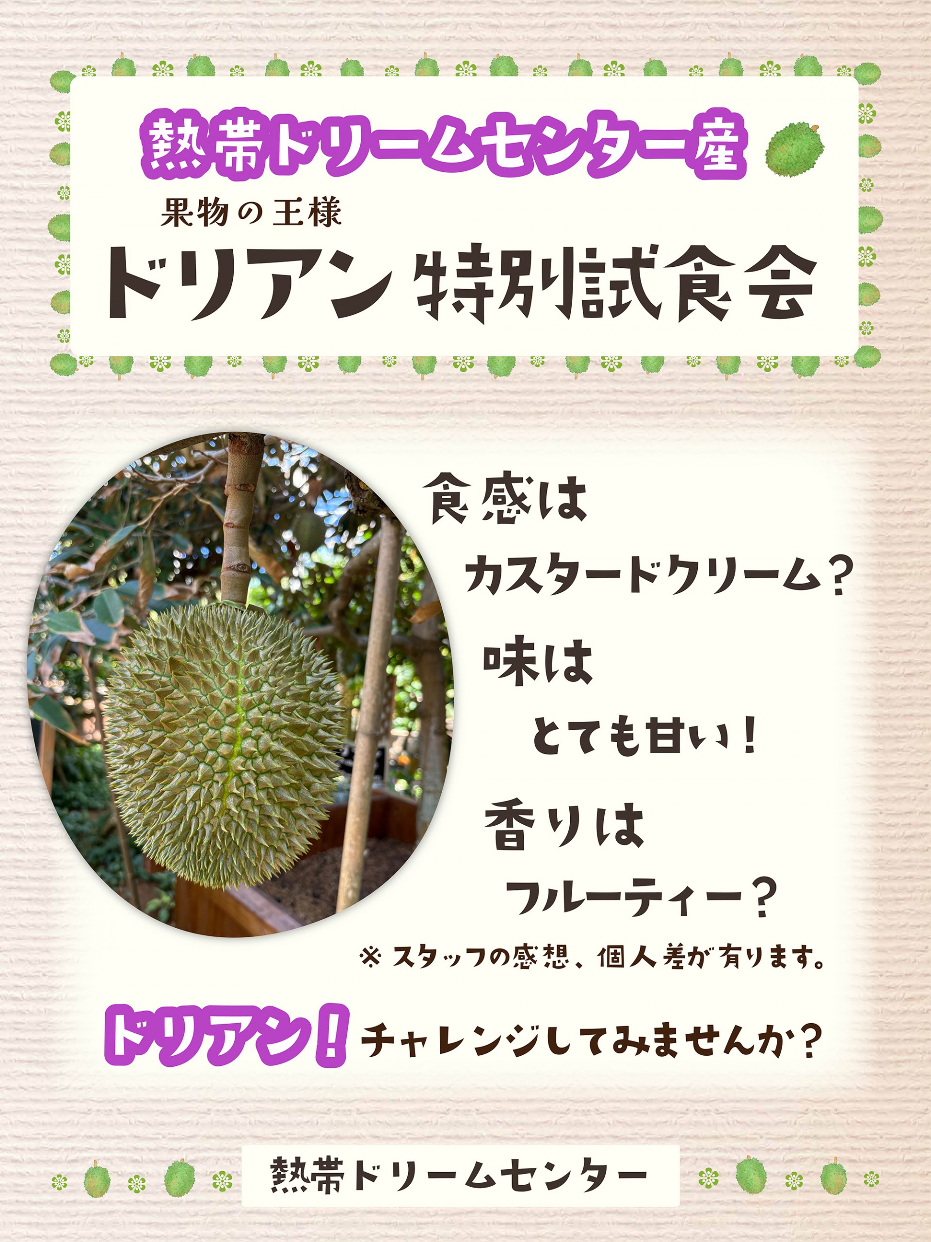 熱帯ドリームセンターで育てた希少なドリアンを、特別に試食できるイベントです。濃厚な味わいと独特な香りを、ぜひこの機会にご体験ください!