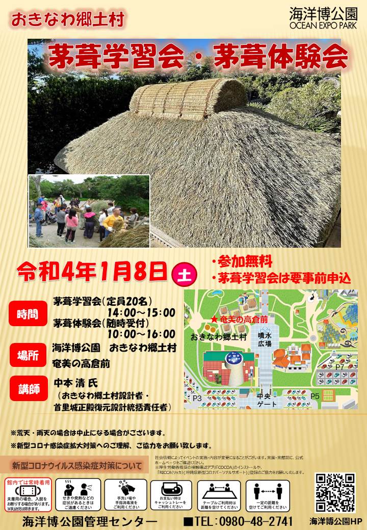 次世代への技術継承が必要な茅葺家屋の伝統技術に興味を持っていただくため、令和4年1月8日(土)に、おきなわ郷土村の設計者を講師に招き、茅葺学習会・茅葺体験会を実施いたします。是非、ご参加ください!