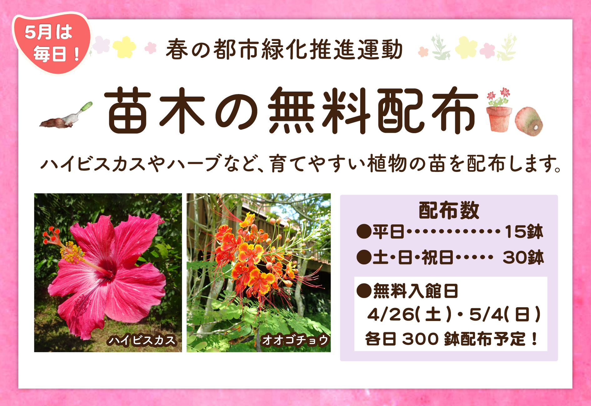ハイビスカスやハーブなど、育てやすい植物の苗木を配布します。