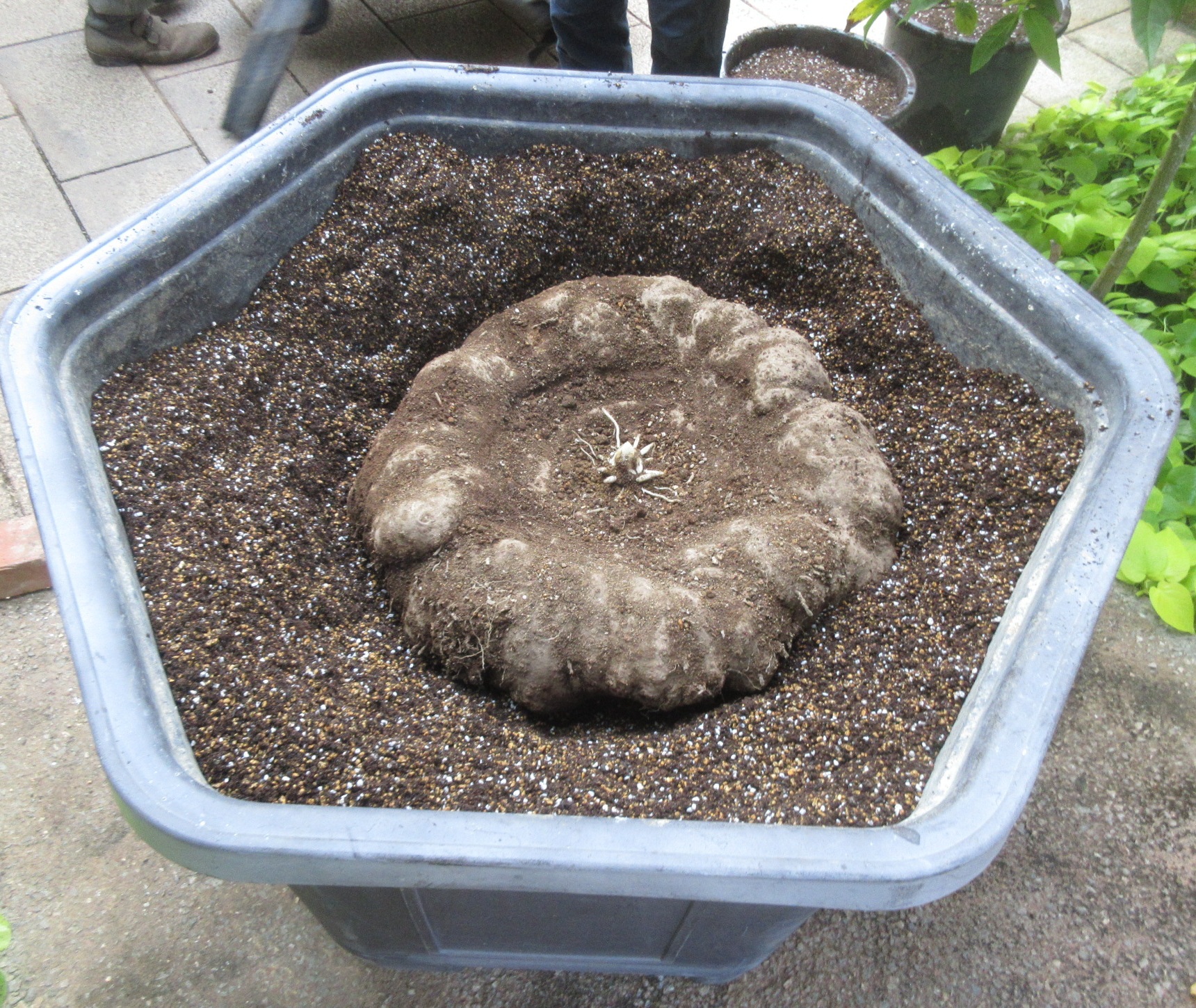今回展示している株は、芋の重さが41kg、7月上旬に芽を出し、8月3日に出蕾を確認しました。