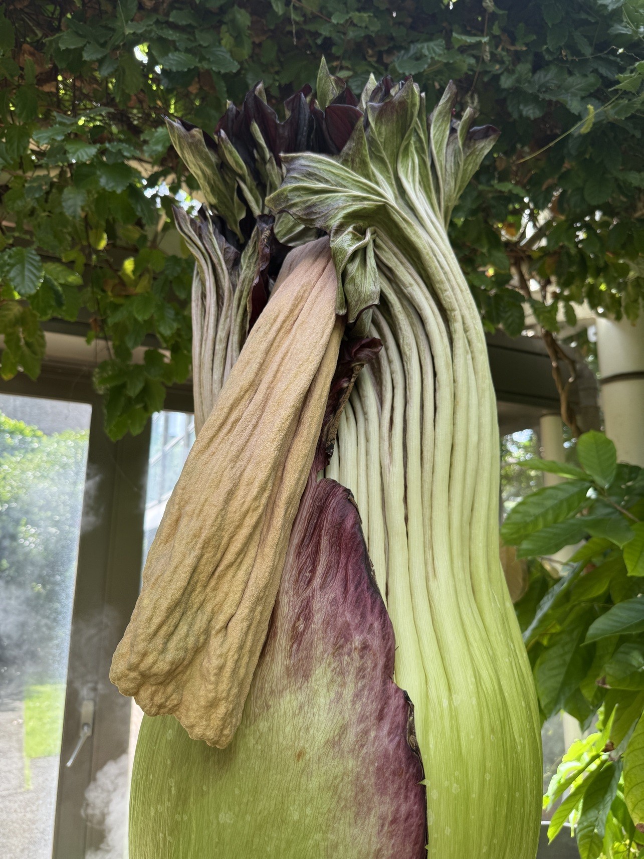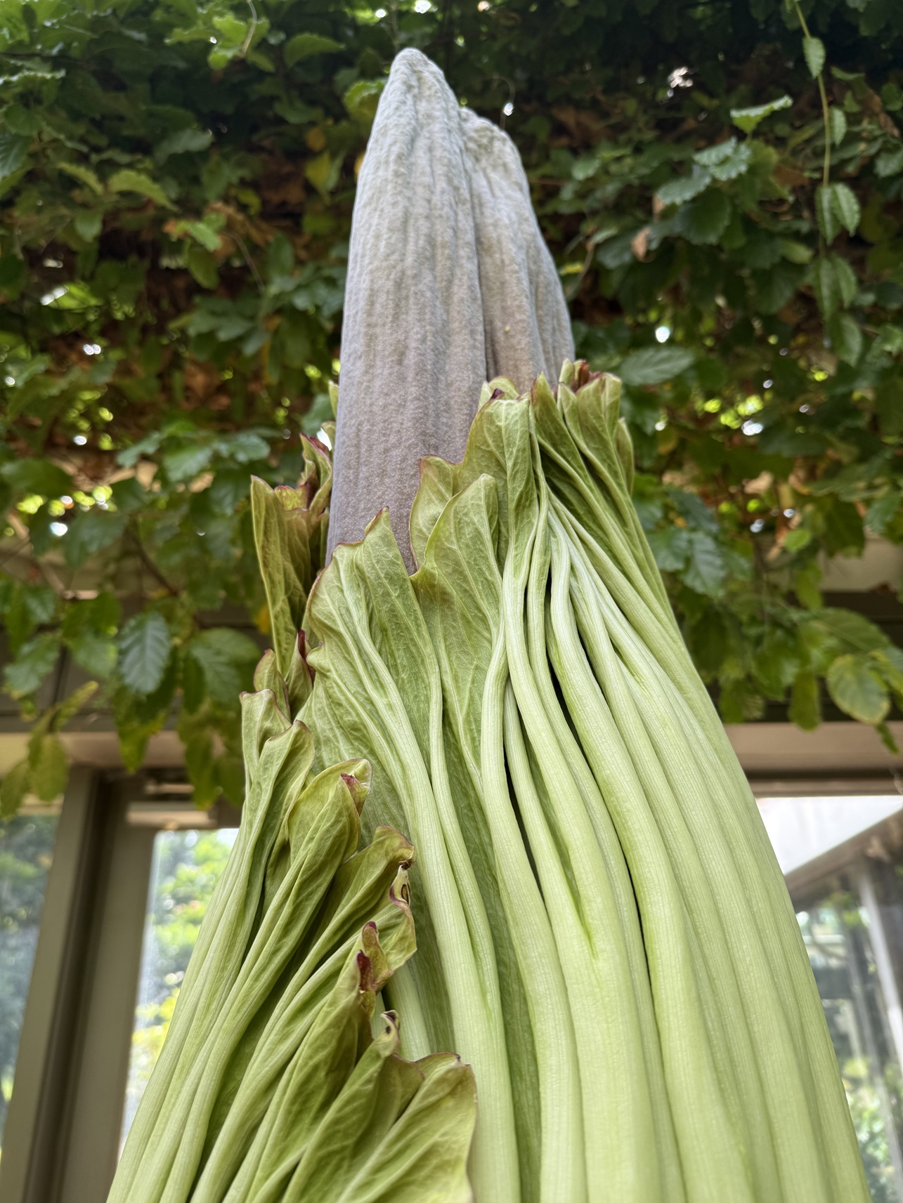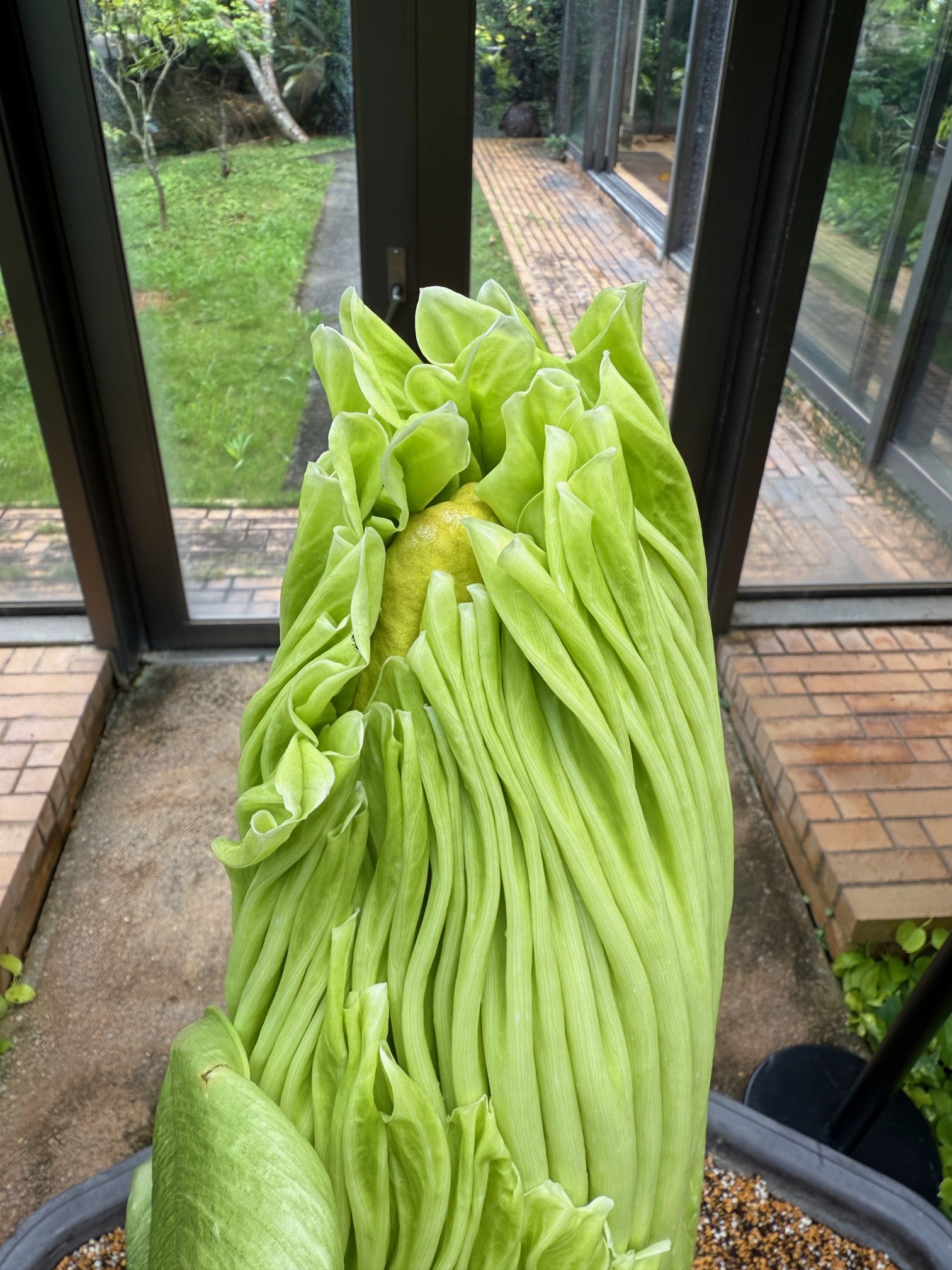 開花5日目です。昨日の夕方、附属体が倒れました。エリマキ状の仏炎苞も閉じてきています。花の終わりを迎えていますが、依然として迫力があります!