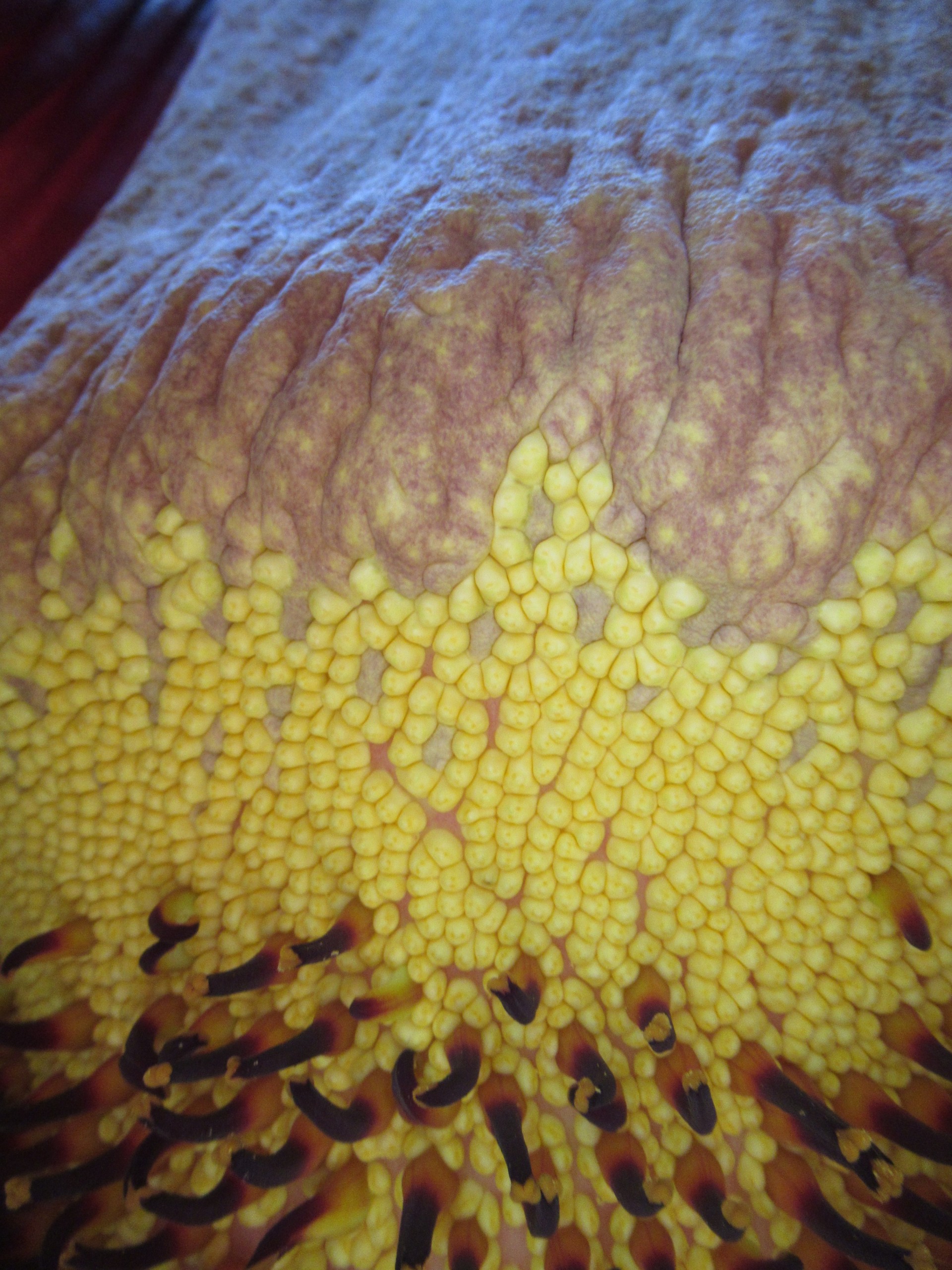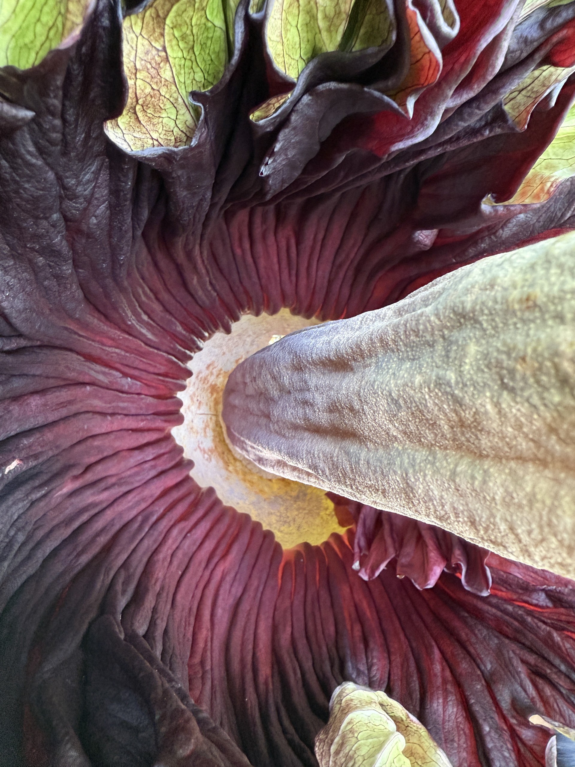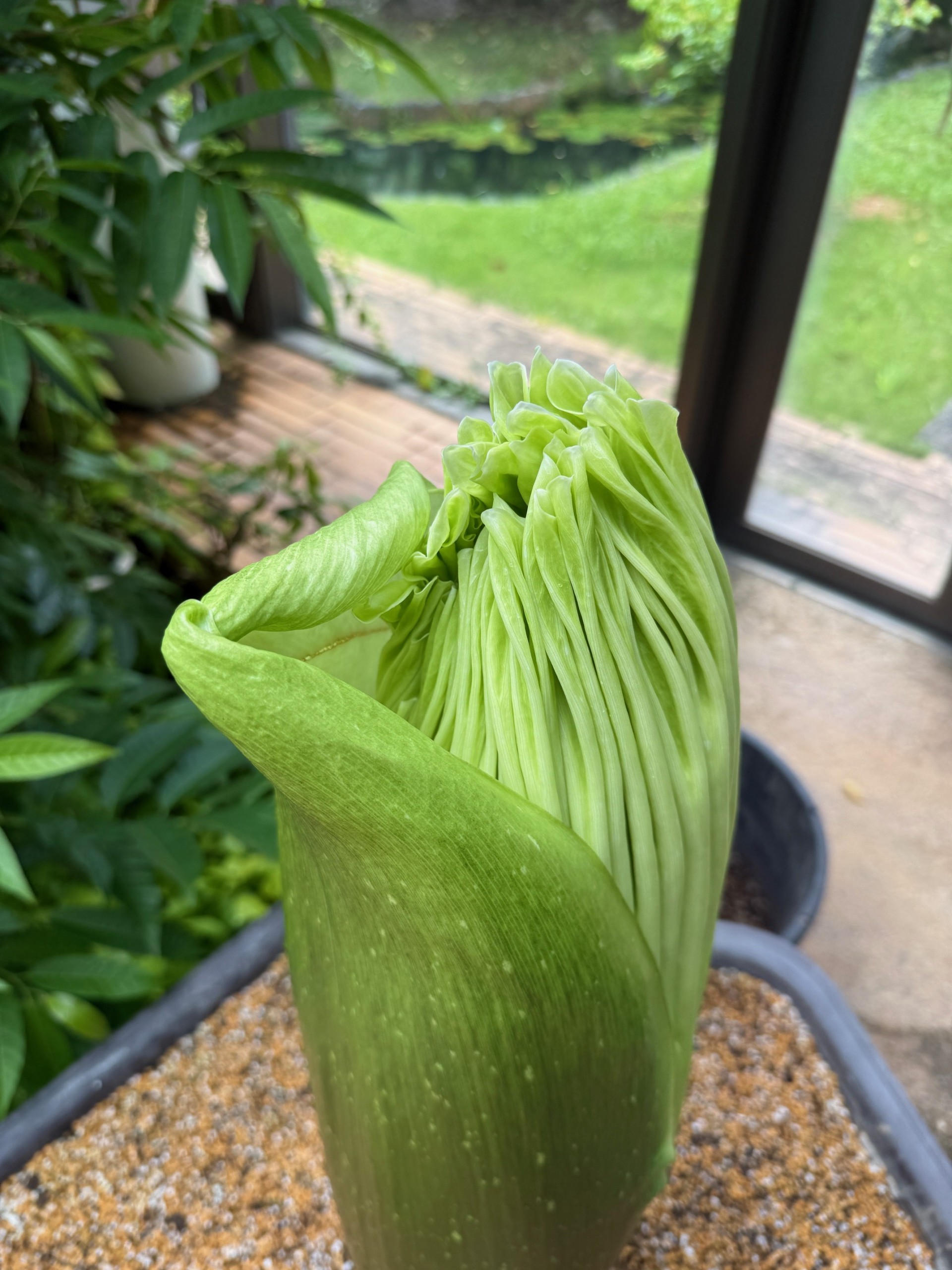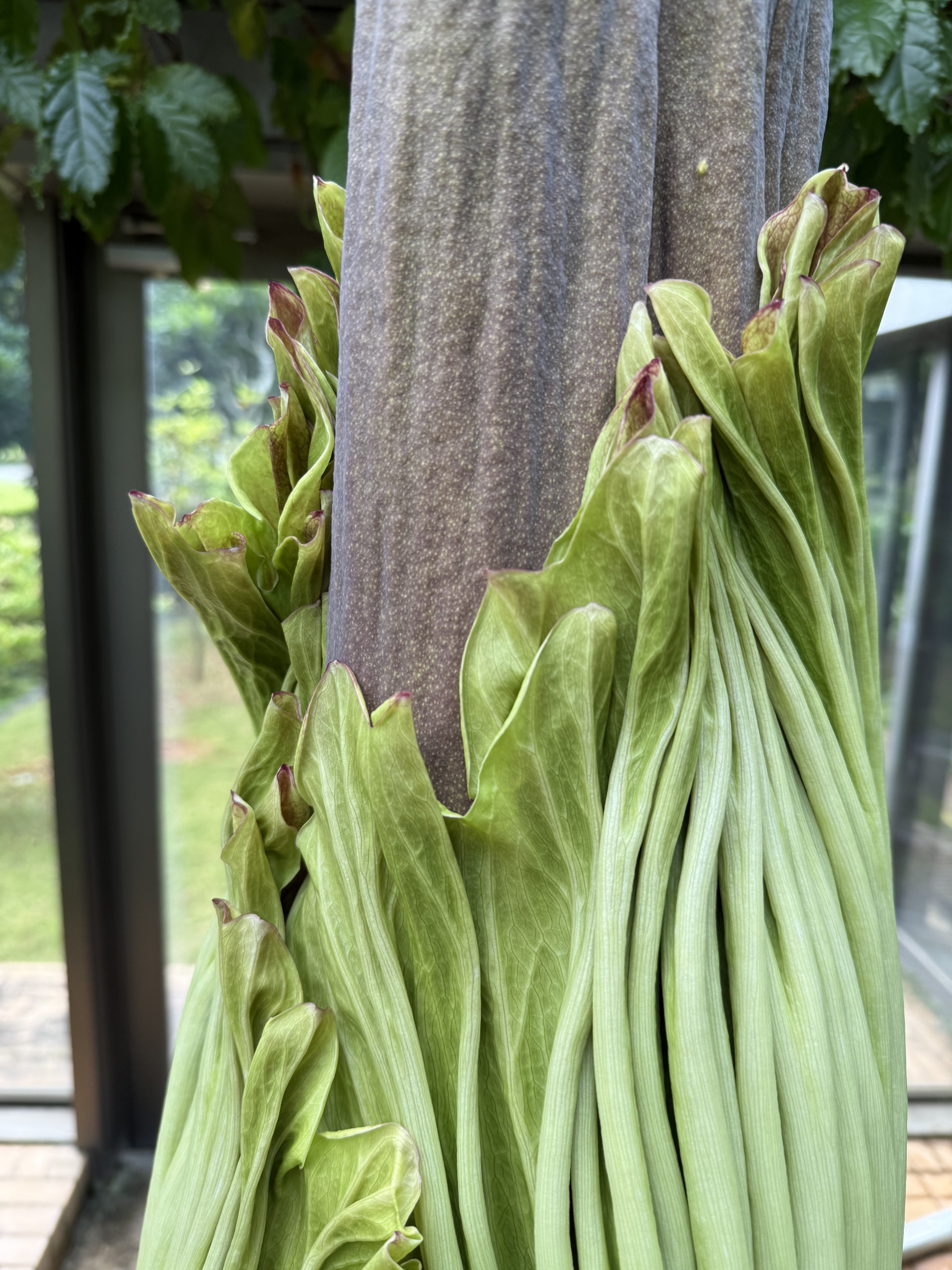 開花5日目です。昨日の夕方、附属体が倒れました。エリマキ状の仏炎苞も閉じてきています。花の終わりを迎えていますが、依然として迫力があります!