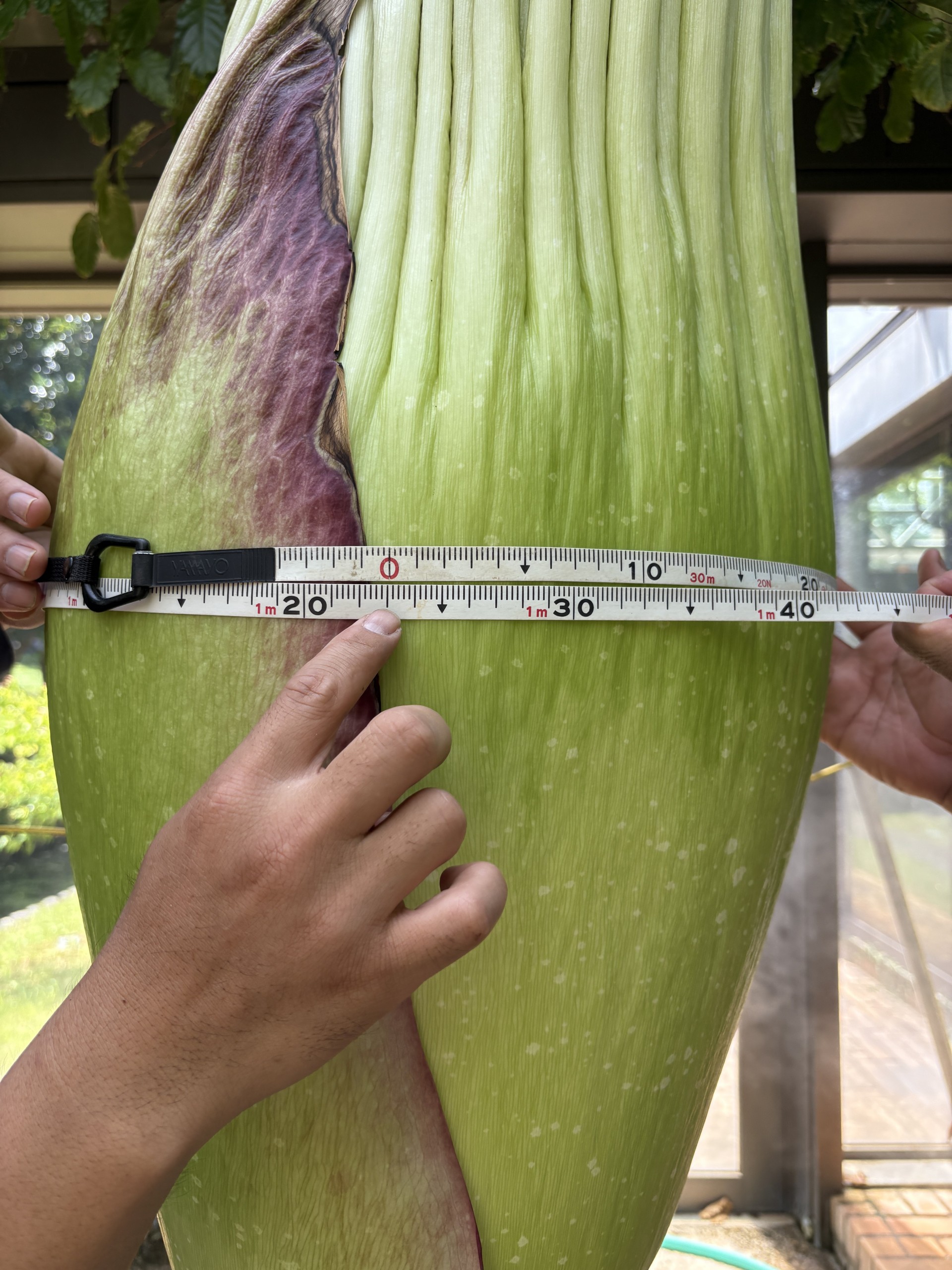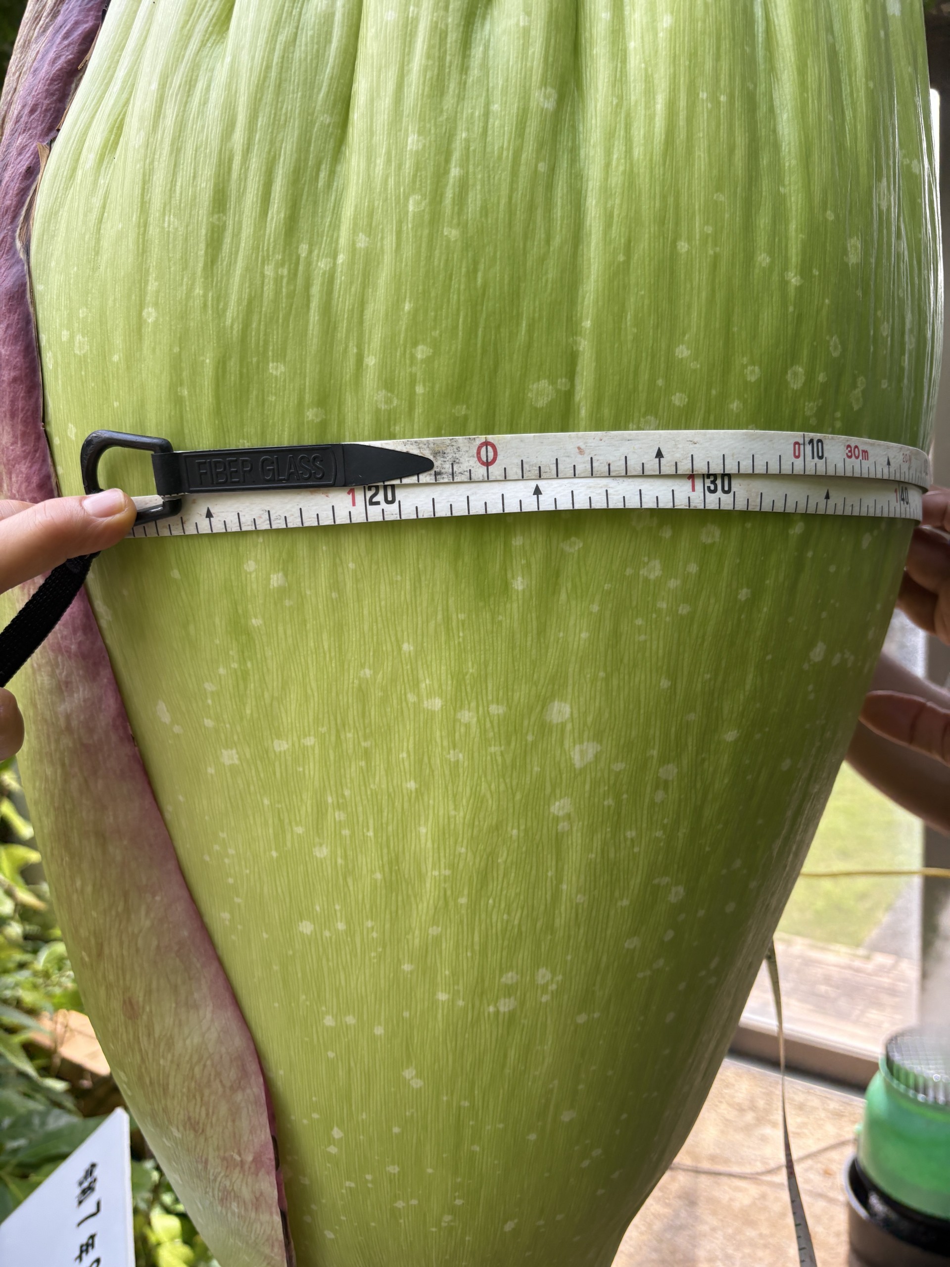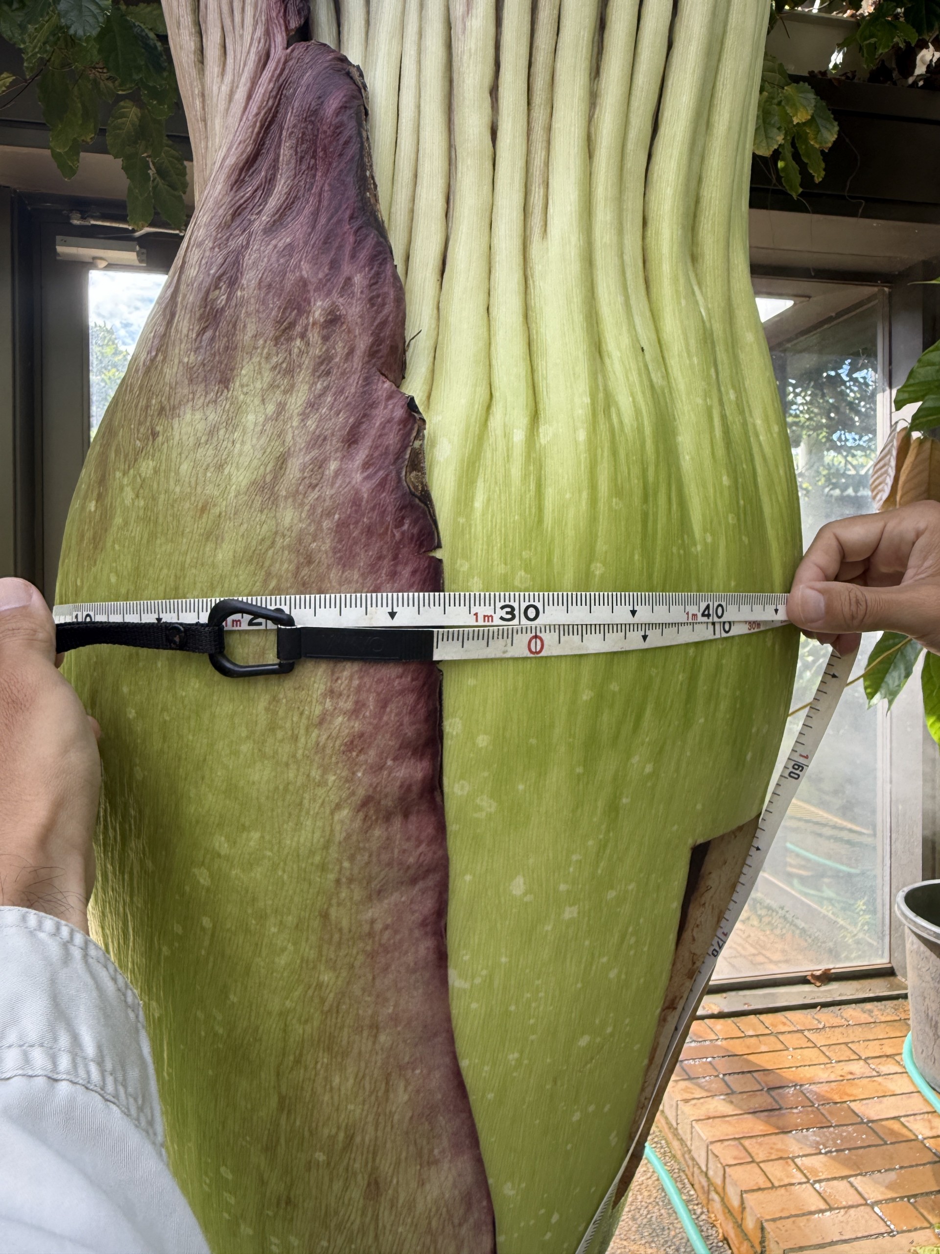 高さが196cmになりました! 仏炎苞が濃くなってきており、開花間近! 胴回りも123㎝と、膨らんできています!