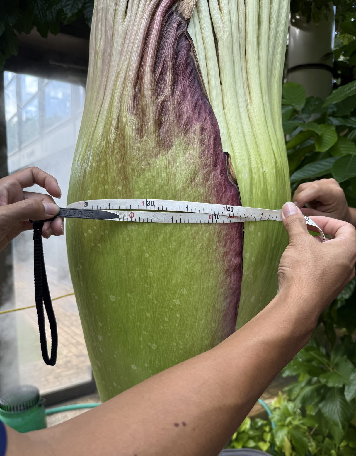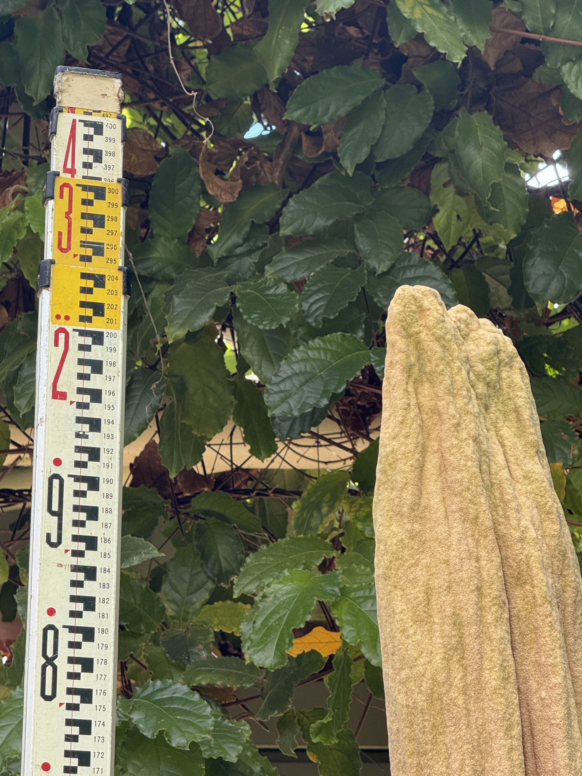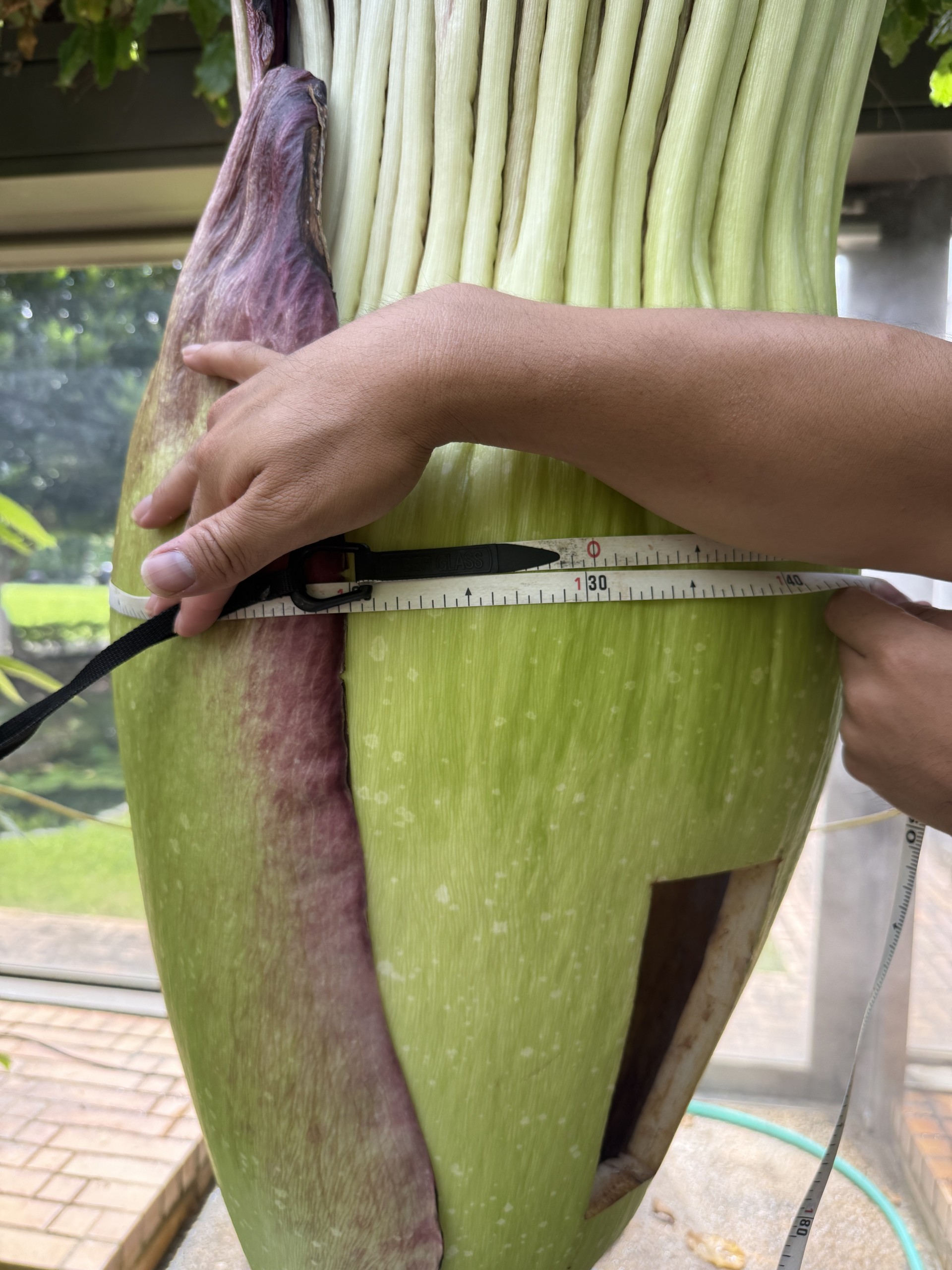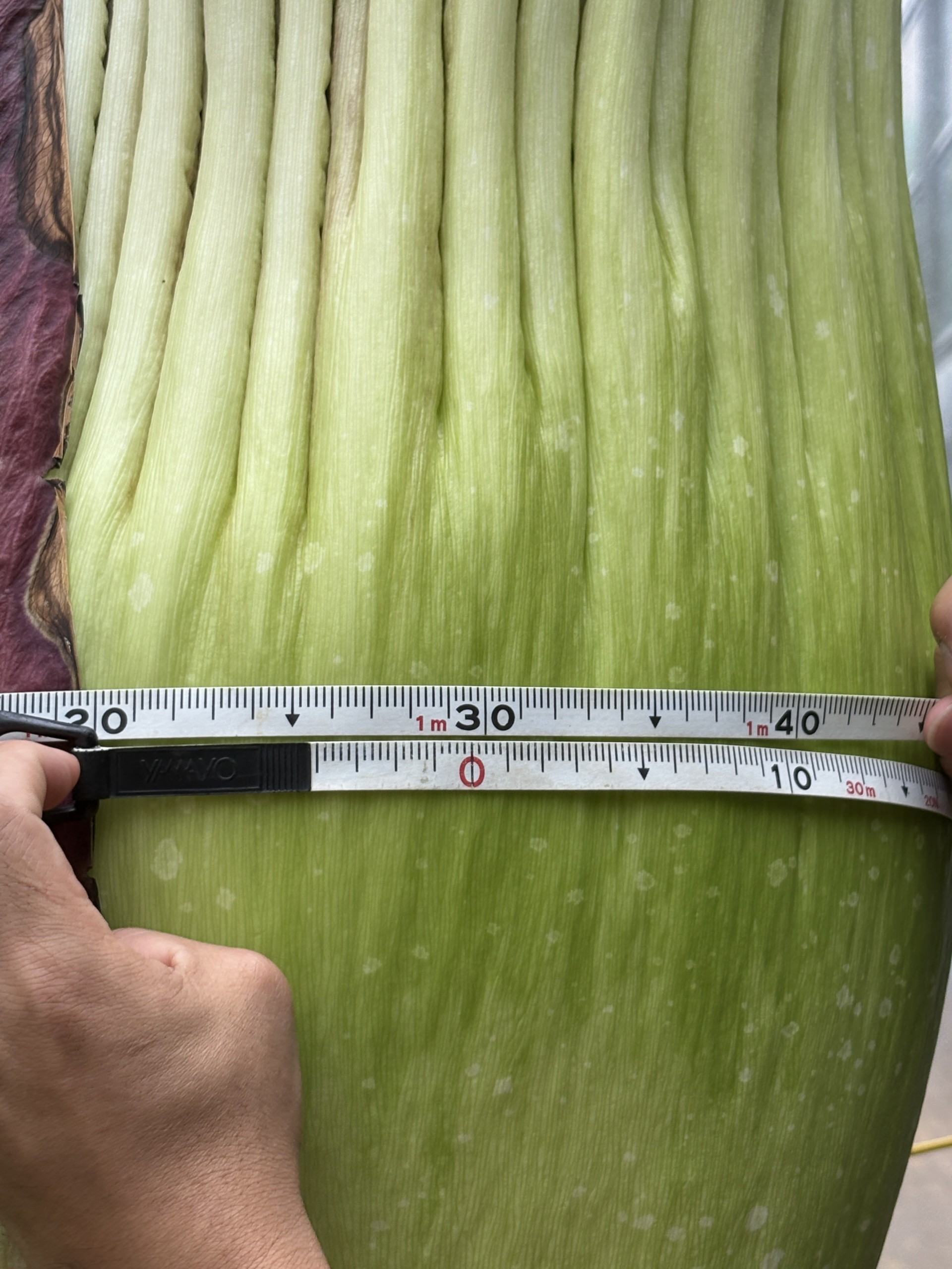 高さが196cmになりました! 仏炎苞が濃くなってきており、開花間近! 胴回りも123㎝と、膨らんできています!