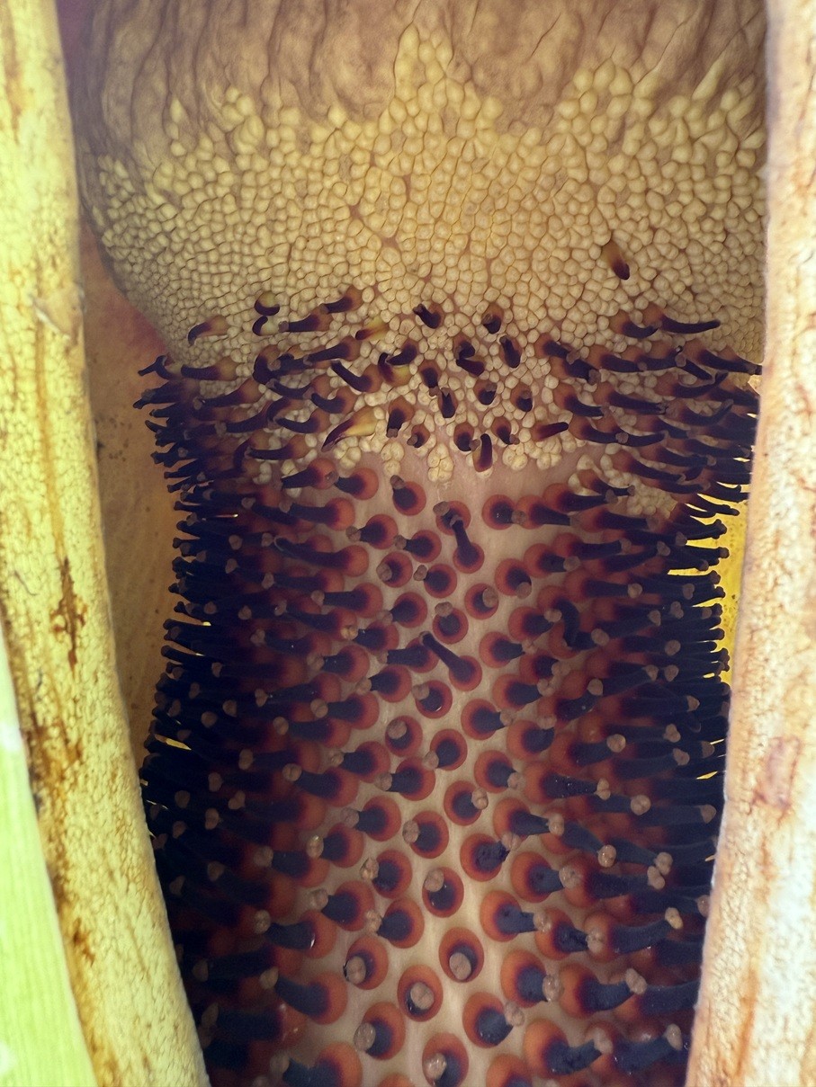 今日は仏炎苞(ぶつえんほう)に雄花(上:黄色)と雌花(下:濃紫色)を観察できる小窓を開けました。ぜひ中の様子もご覧ください!