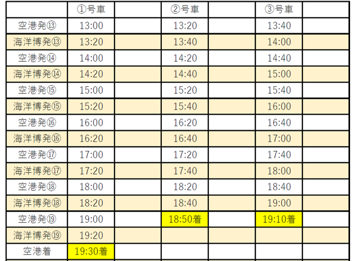 3月15日(日) 無料シャトルバス時刻表 上本部飛行場跡地⇔海洋博公園(10分毎)