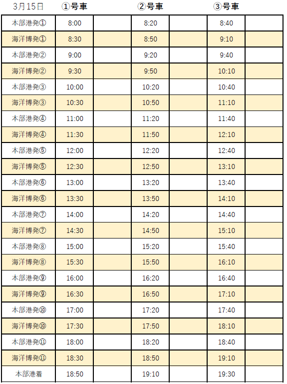 3月15日(日) 無料シャトルバス時刻表 本部港⇔海洋博公園(10分毎)