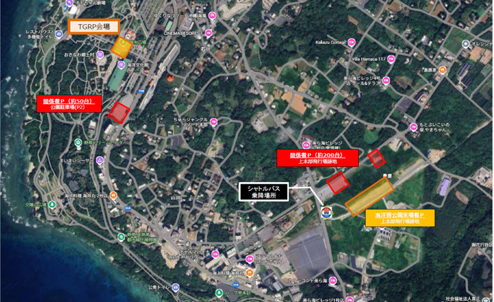 臨時駐車場からは、無料のシャトルバスも運行いたします。※海洋博公園のシャトルバス発着場所はP4駐車場となります。
