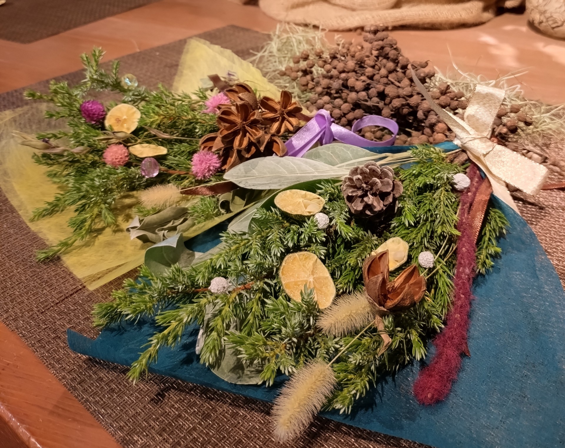 | 内容 | ハイネヅを束ねて、マツボックリやゲットウの実で飾り付け!最後にオーナメントで仕上げれば、オリジナルスワッグの完成です! |