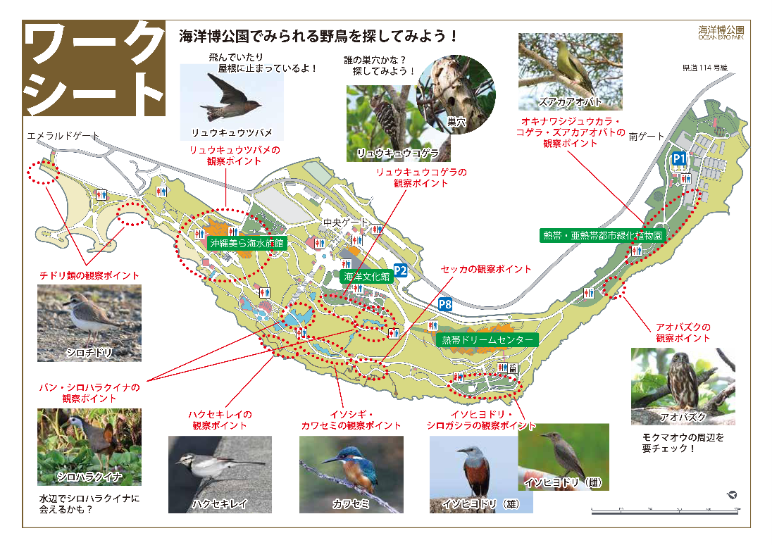 海洋博公園では、令和 7 年 12 月 14 日(日)に「バードウォッチング」を開催します。海洋博公園には水辺や林など様々な自然環境があり、数多くの渡り鳥が訪れるため、身近な野鳥観察にはピッタリの環境です。公園内で見られる身近な野鳥や、冬に渡ってくる鳥を専門家と観察し、鳥の生態や植物との関係などを分かりやすく解説します。