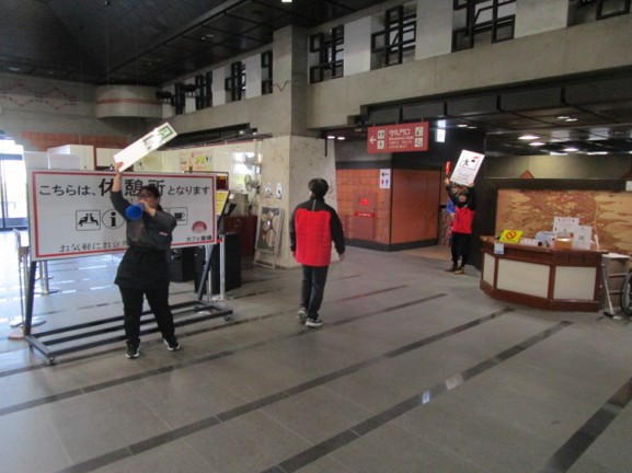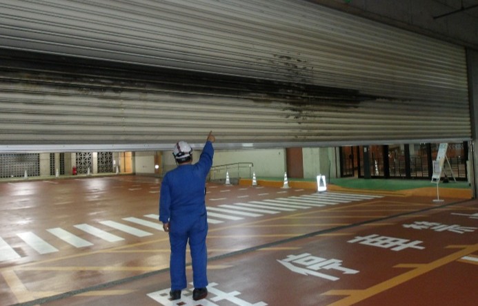 公園管理スタッフによるミーティング              防火シャッター作動確認