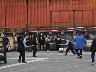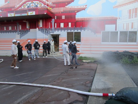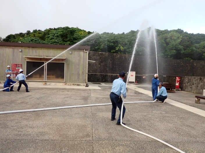 工事業者による消火栓放水訓練             警備員、監視員による屋外消火栓放水訓練