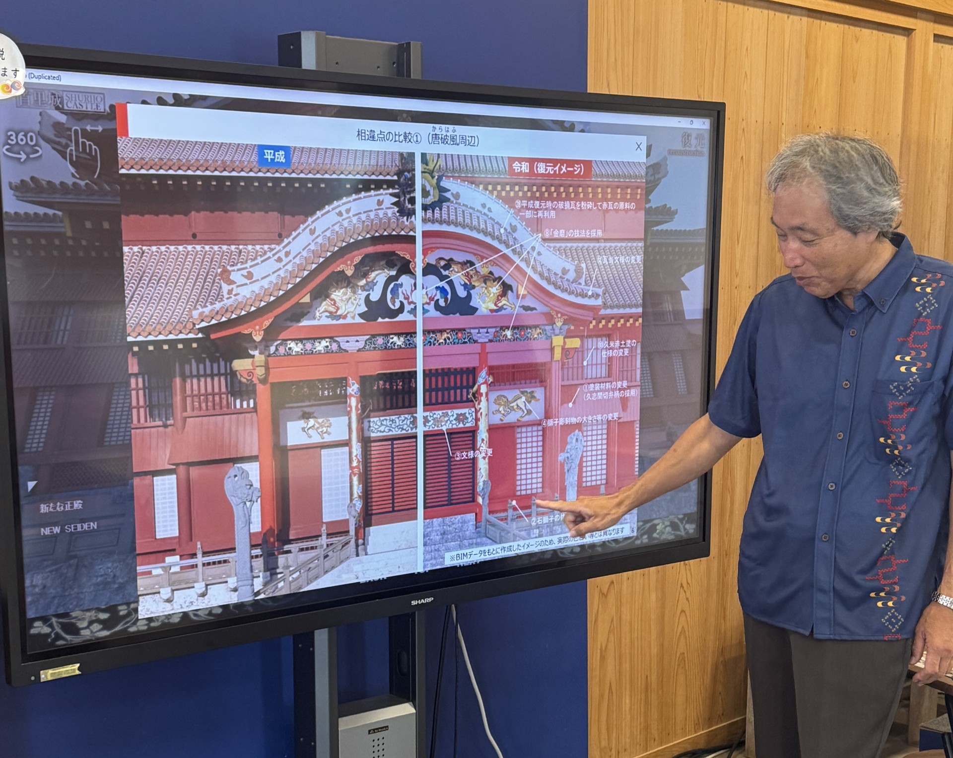 6年前に焼けた正殿に載っていた獅子瓦は、一部が破損し有料区域内にある復興展示室というところで展示されていましたが、先方からの要望で今はフランスに貸出しています。フランスはそれを本国に持ち帰らず、今は大阪万博のフランス館に置かれています。現在、フランス館に行けばノートルダム寺院の人面像と並んで首里城の獅子瓦を見学することができます。