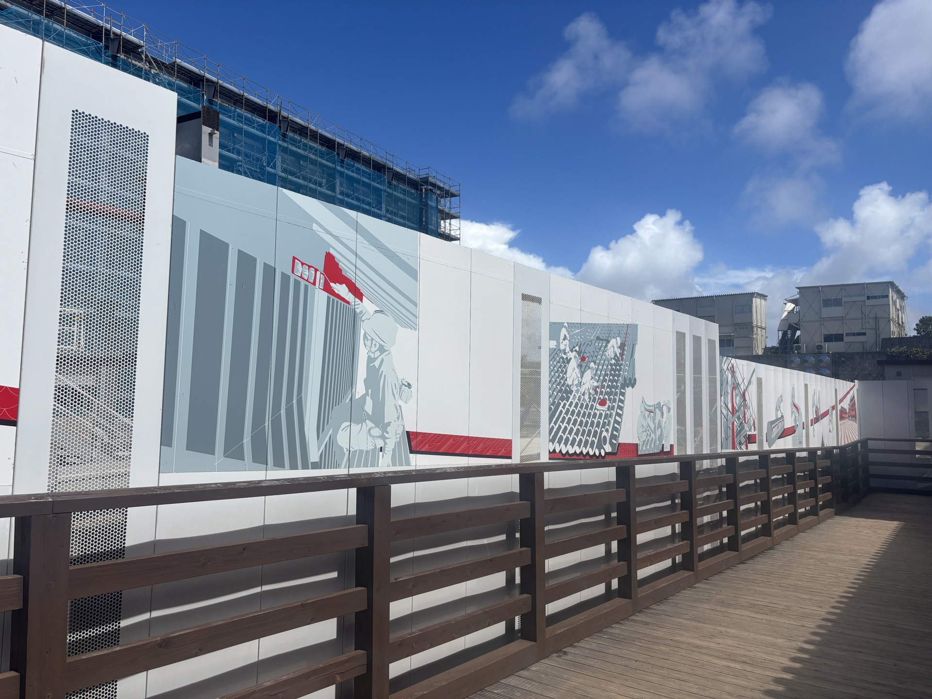 有料区域に入ってすぐの壁には、復興に携わる職人さん達の作業の様子が描かれています。スロープを上がりながら、首里城を再建するために必要な様々な技術を、イラストや写真を通して知る事ができます。