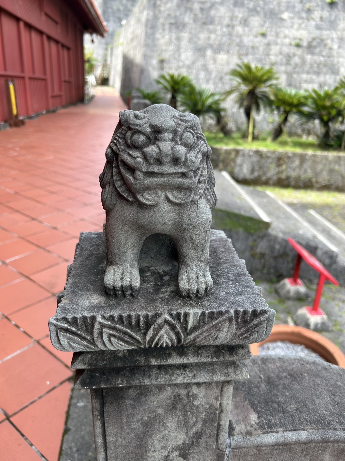 奉神門にいる可愛い表情のシーサー♪細粒砂岩を彫っているそうですが、穏やかな表情を彫ることができる技術がとても素晴らしいと感じました。