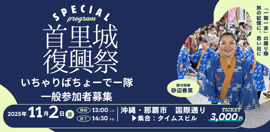 令和7年11月2日(日)、那覇市・国際通りで開催される「首里城復興祭 琉球王朝絵巻行列」に、参加者として加わることができる特別プログラムです。