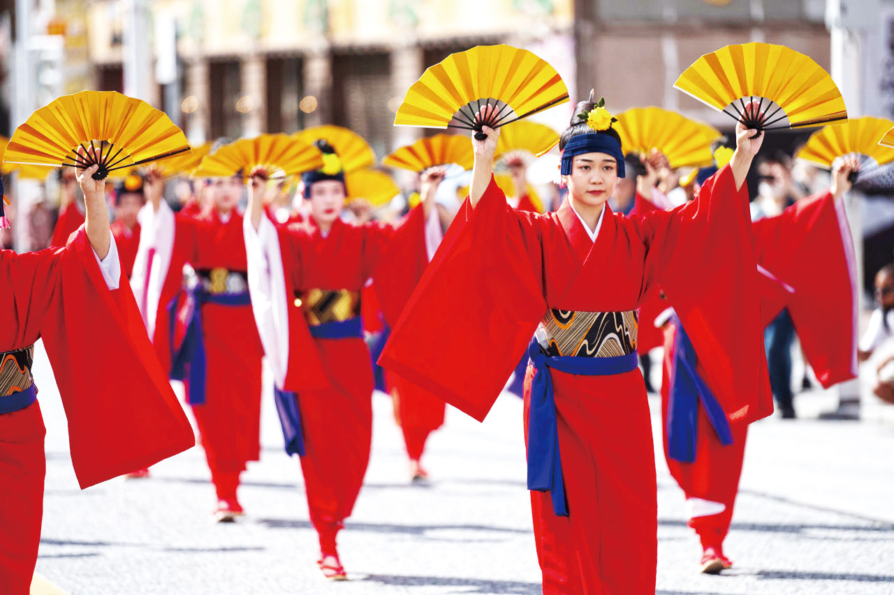 「いちゃりばちょーでー」とは、“一度会えば皆兄弟”という沖縄の言葉。初めて出会う人とも一緒に、琉球の伝統衣装を身にまとい、手踊りを披露して行列に参加できます。