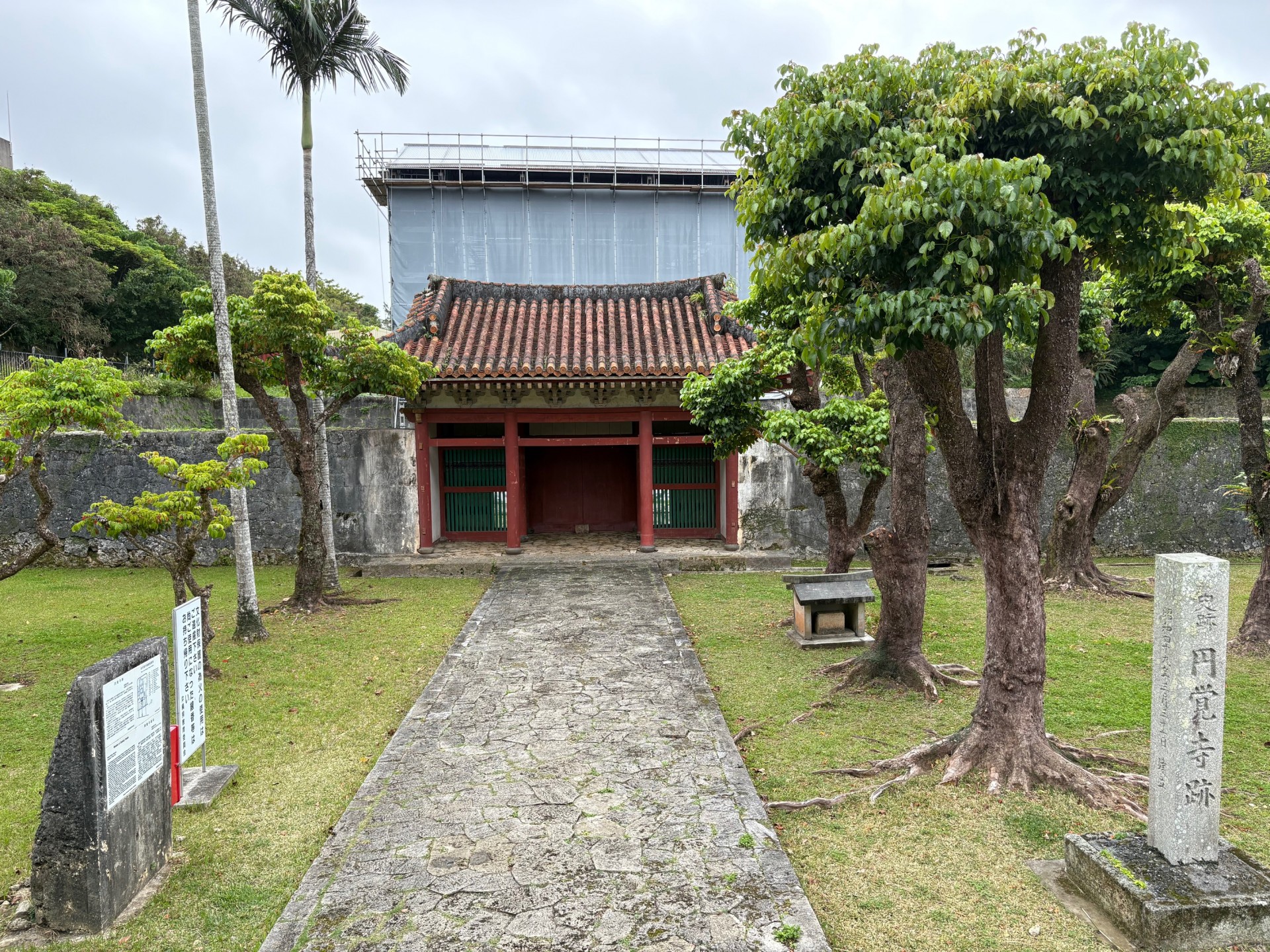現在、三門(さんもん)の復元が進められています。首里城(しゅりじょう)の奉神門(ほうしんもん)をくぐった先にある北側見学通路から円覚寺(えんかくじ)の様子を見ることができます。