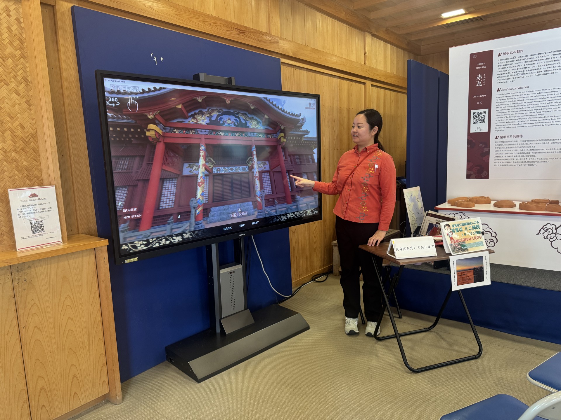<世誇殿でのタッチパネル解説>大型画面で首里城正殿の細部や色彩の魅力を紹介。