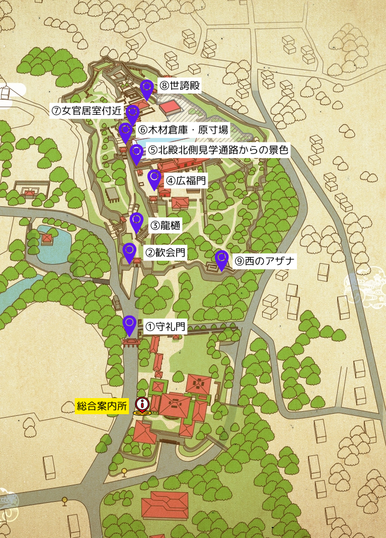 ⑥木材倉庫・原寸場 ⑦女官居室付近 ⑧世誇殿 ⑨西のアザナ