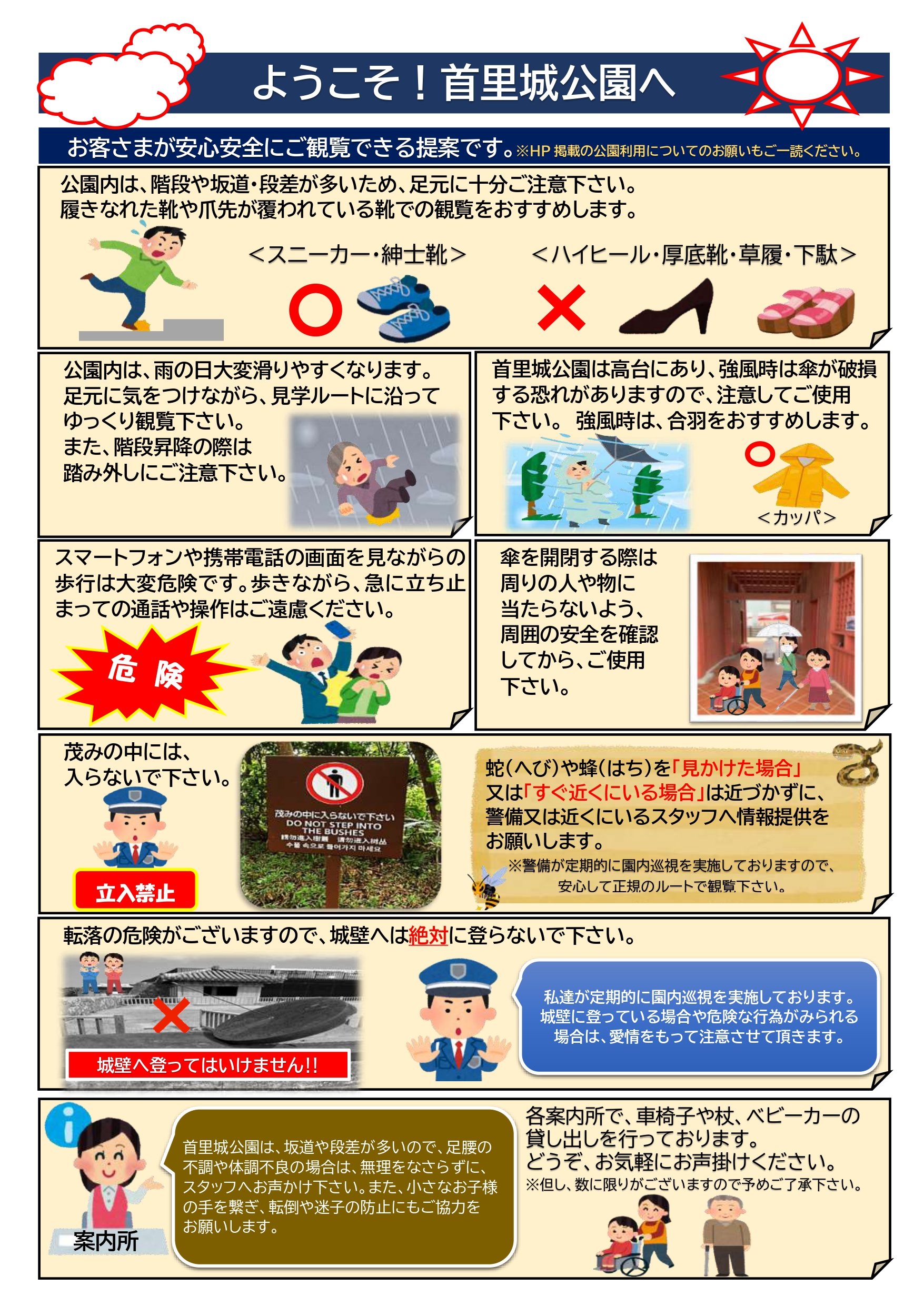 首里城公園は、坂道や段差が多いので、足腰の不調や体調不良の場合は、ご無理をなさらずに、スタッフへお声かけ下さい。各案内所では、車椅子や杖、ベビーカーの貸し出しも行っております。また、小さなお子様の手を繋ぎ、転倒や迷子の防止にもご協力をお願いします。首里城公園には看護師が常駐しております。